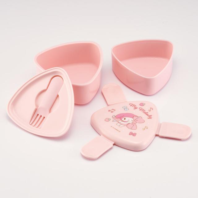 弁当箱 2段 500ml 抗菌三角おにぎりランチボックス マイメロビックリボン ( マイメロディ おにぎりケース おむすびケース 2個用 お弁当箱 レンジ対応 日本製 レンジOK おにぎり弁当 三角おにぎり フォーク付き 銀 AG 抗菌加工 )