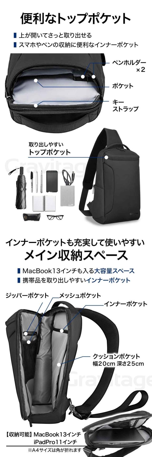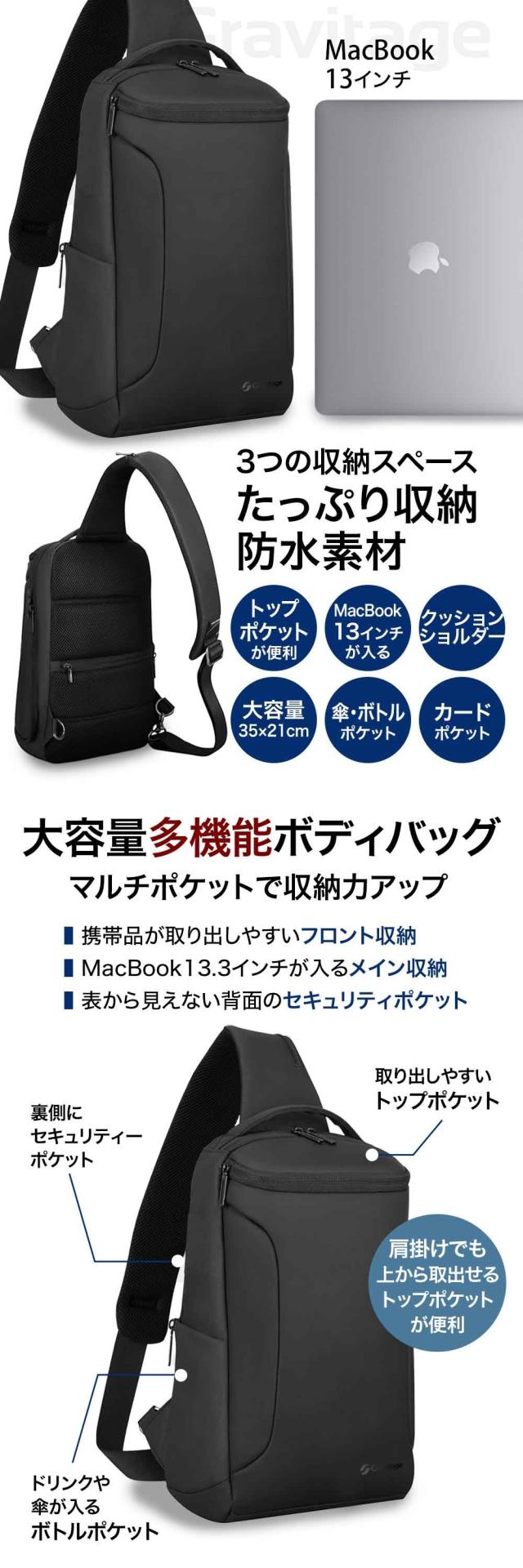 ボディーバッグ 4ポケット 大容量 防水 撥水 PC パソコン ボトル ポケット ショルダーバック スリングバッグ ワンショルダー リュック バレンタイン プレゼント