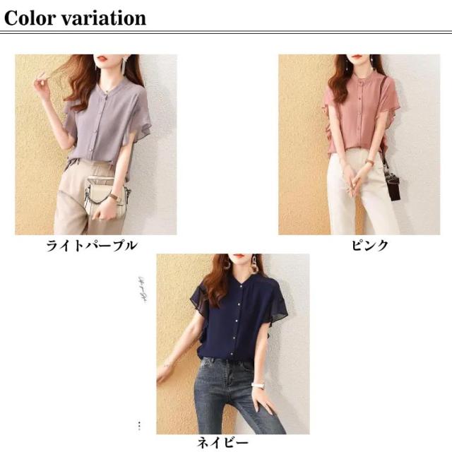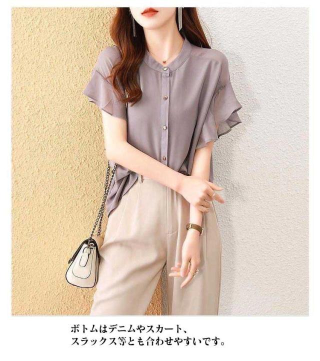 シャツ シフォンブラウス フリル袖 レディース ブラウス オフィス 前開きシャツ 半袖ブラウス フリル袖 無地 夏コーデ トップス 大人可愛い フレアスリーブ フレンチスリーブ フォーマル 薄手 フリル カジュアル 通勤 OL 結婚式