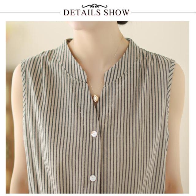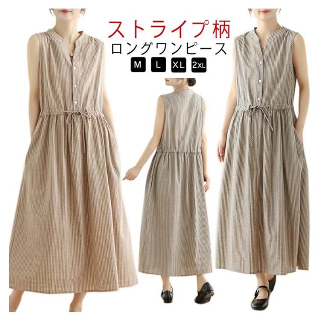 春 送料無料 ノースリーブ ワンピース シャツワンピース リボン付き マキシワンピース Aライン スタンドカラー レディース 夏 ギャザー ストライプ 美シルエット きれいめ ロング丈 綿麻 リネン シンプル 送料無料 無地 涼しい おしゃれ カジュアル 通勤