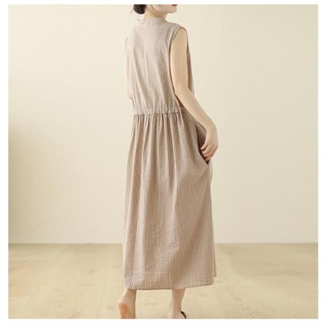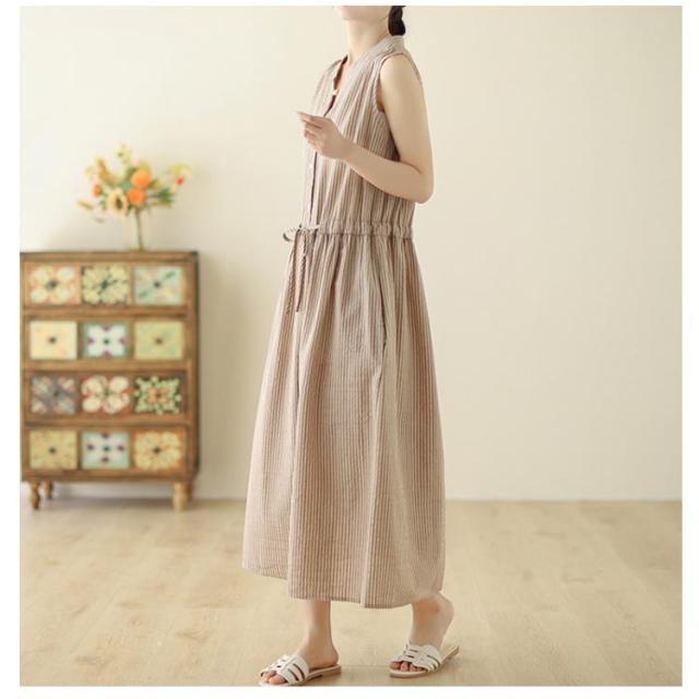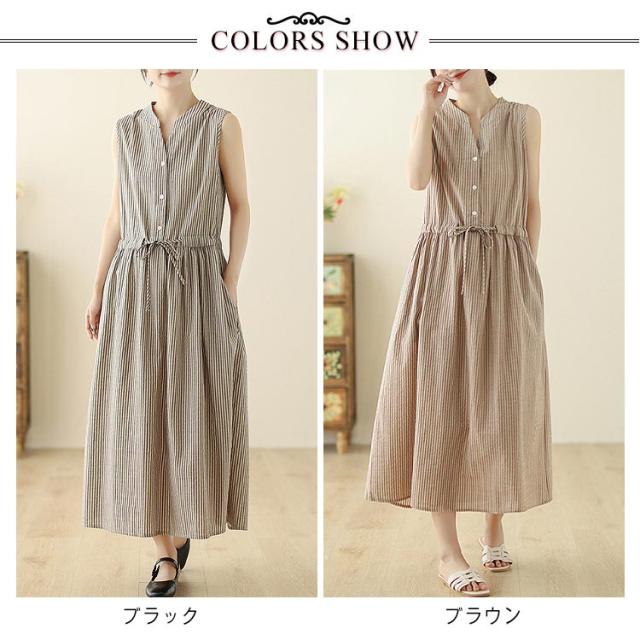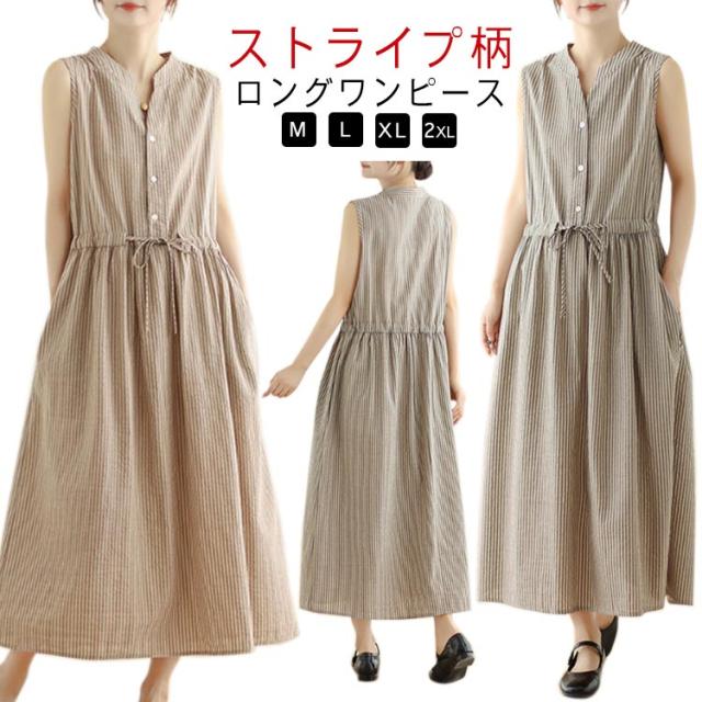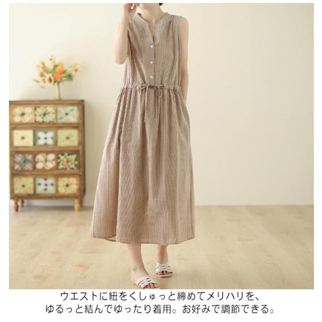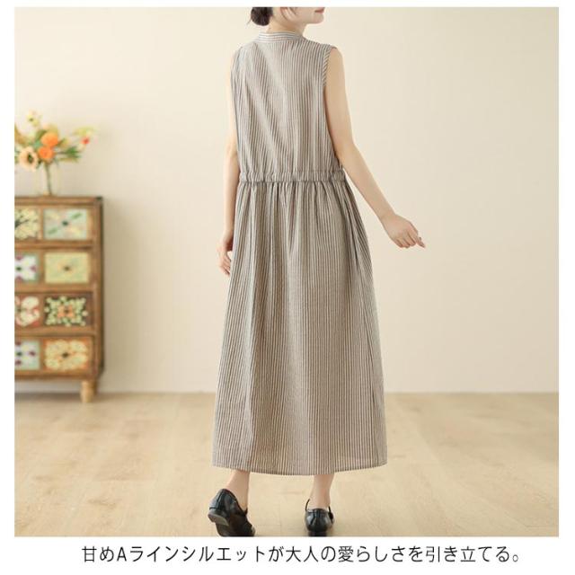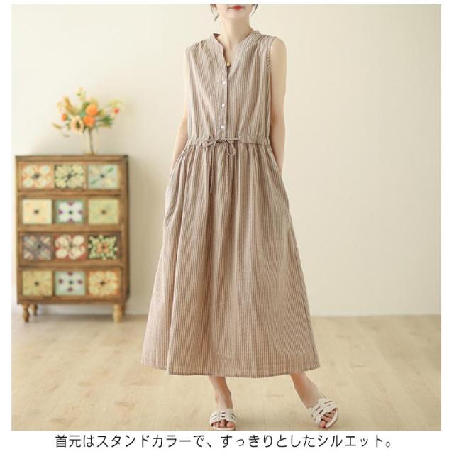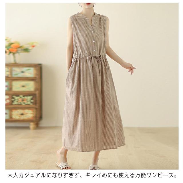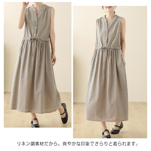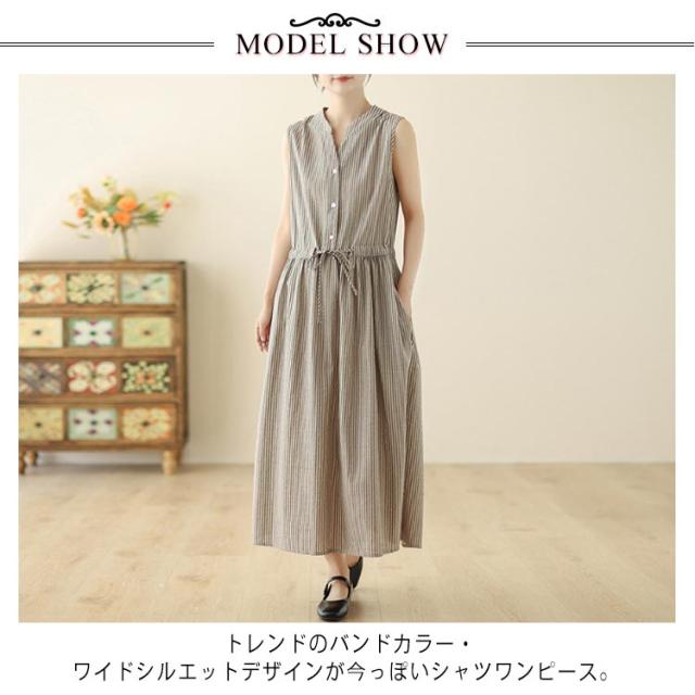 夏 リボン付き シャツワンピース ストライプ ロングワンピース 送料無料 ロング丈 ワンピース スタンドカラー マキシワンピース レディース 送料無料 Aライン 美シルエット きれいめ ノースリーブ 綿麻 リネン 春 涼しい 無地 シンプル おしゃれ カジュアル 通勤