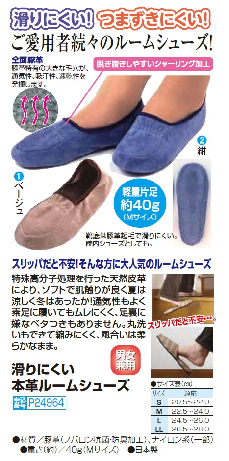 日本製 滑りにくい本革ルームシューズ 全2色 単品 1足 部屋履き スリッパ 男女兼用 レディース 婦人 ミセス シニア メンズ 紳士 男性用 女性用 紺 ネイビー ベージュ シニアファッション 40代 50代 60代 70代 80代 母の日 お母さん 父の日 お父さん mk p24964