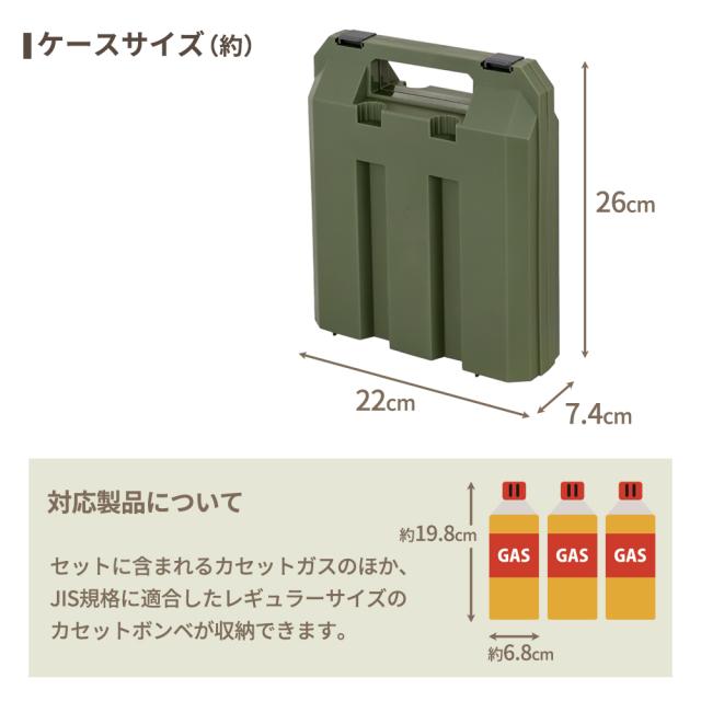 サイズ(約):カセットガス/幅20.4×奥行7×高さ20cm(パッケージサイズ) 収納ケース/幅22×奥行7.4×高さ26cm