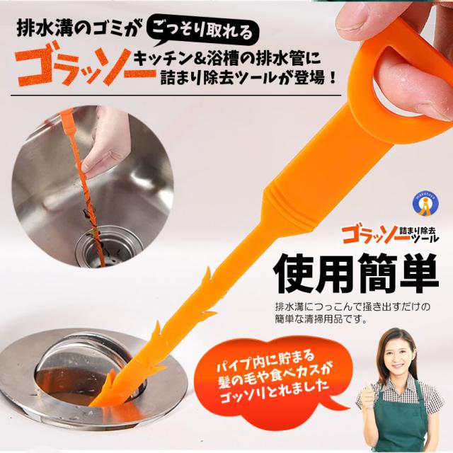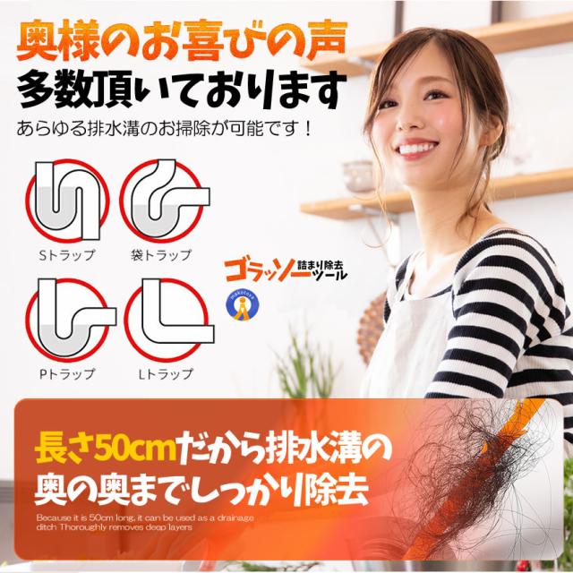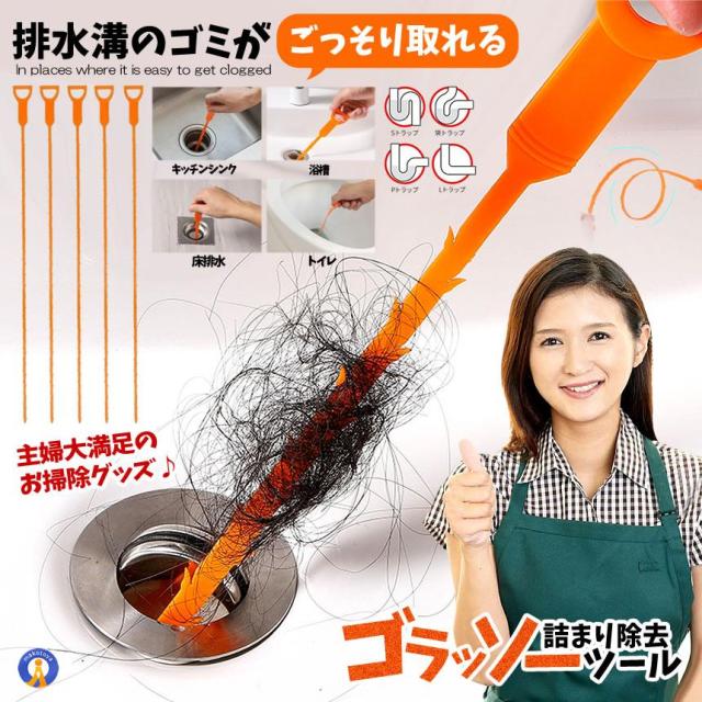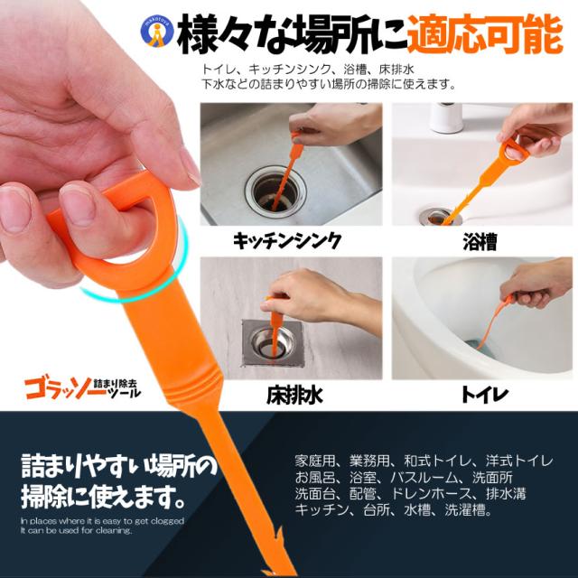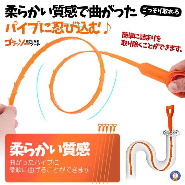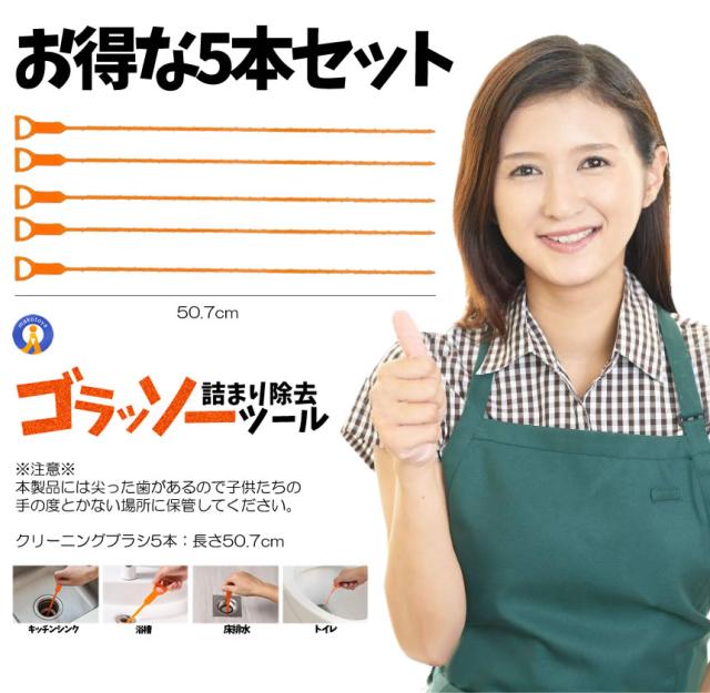 排水溝のゴミがごっそり取れるゴラッソー排水管詰まり除去ツールが登場!柔らかい質感で曲がったパイプに柔軟に曲げることができ簡単に詰まりを取り除くことができます。排水管掃除ツールは様々な場所に適しており家庭用、業務用、和式トイレ、洋式トイレお風呂、浴室、バスルーム、洗面所、洗面台配管、ドレンホース、排水溝、キッチン、台所、水槽、洗濯槽。使用簡単排水溝につっこんで掻き出すだけの簡単な清掃用品です。効率的にパ イプ内に貯まる髪の毛食品や他のゴミがゴッソリとれましたクリーニングブラシ5本:長さ50.7cm送料無料