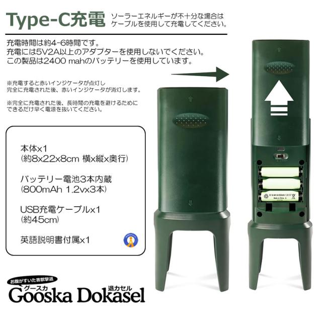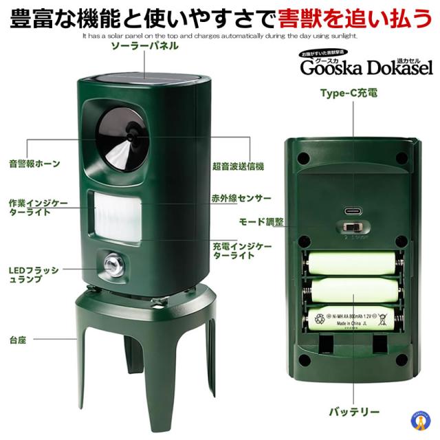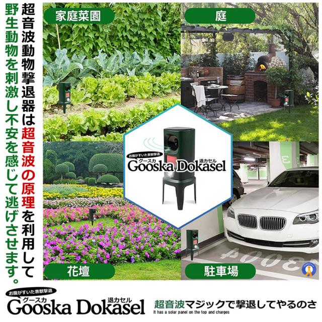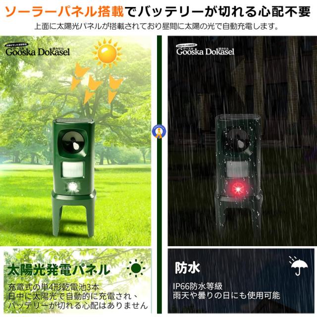 超音波動物撃退器は超音波の原理を利用して野生動物を刺激し不安を感じて逃げさせます。センサー式で動きを感知して追い払う例えば中庭にマシンを配置し野良猫や犬などの野生動物が近づくとデバイスが自動的に検出し周波数変換超音波やLEDフラッシュランプなどが発動します。超音波は人間には聞こえにくいですが野生動物には敏感に聞こえ反応する仕組みとなっております。※音は野生動物の聴覚や健康に悪影響を与えることはありません。ソーラーパネル搭載でバッテリーが切れる心配不要上面に太陽光パネルが搭載されており昼間に太陽の光で自動充電します。付属品本体x1(約8x22x8cm 横x縦x奥行)バッテリー電池3本内蔵(800mAh 1.2vx3本)USB充電ケーブルx1(約45cm)英語説明書付属x1送料無料