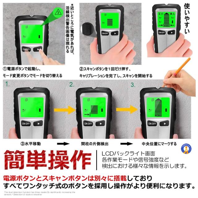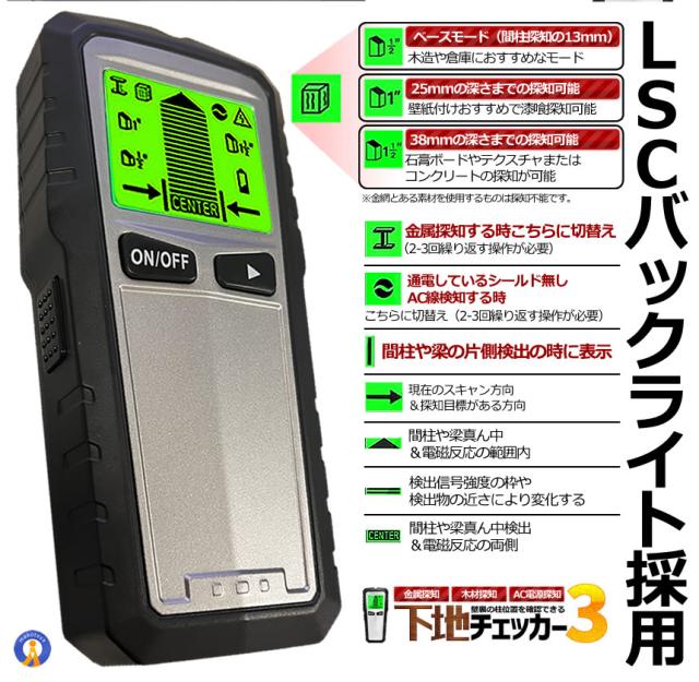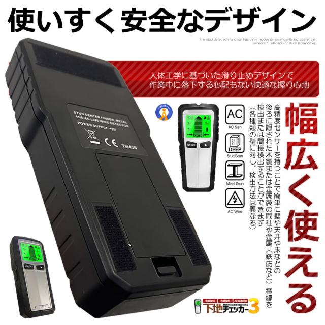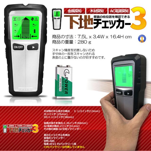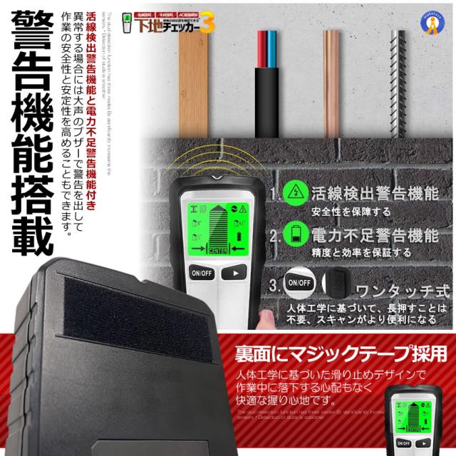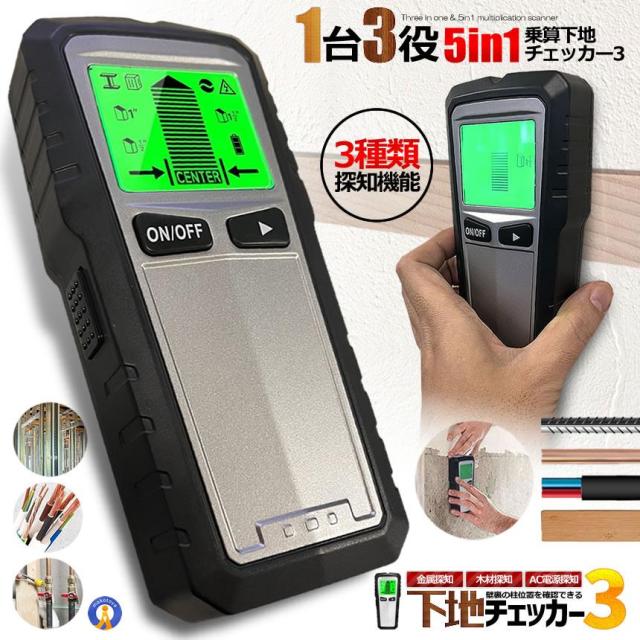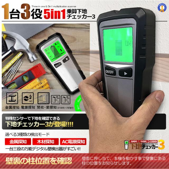 一台三役&5in1乗算スキャナー特殊センサーで下地を確認できる「下地チェッカー3」が登場!!!!選べる3種類の検出モード「金属探知」「木材探知」「AC電源探知」一台三役の万能デジタル壁検出器がすごい!!壁裏にある柱の位置を確認するセンサーです。壁面に押し当て、本機を動かす事で壁裏にある柱の位置をお知らせします。3つの探知機能最新型の高精度スキャンセンサーが間柱センサー&金属探知器及びシールド無しAC線(通電している)の探知器として活用できます。LCDバックライト画面警告機能搭載双方向型較正機能&操作簡単送料無料