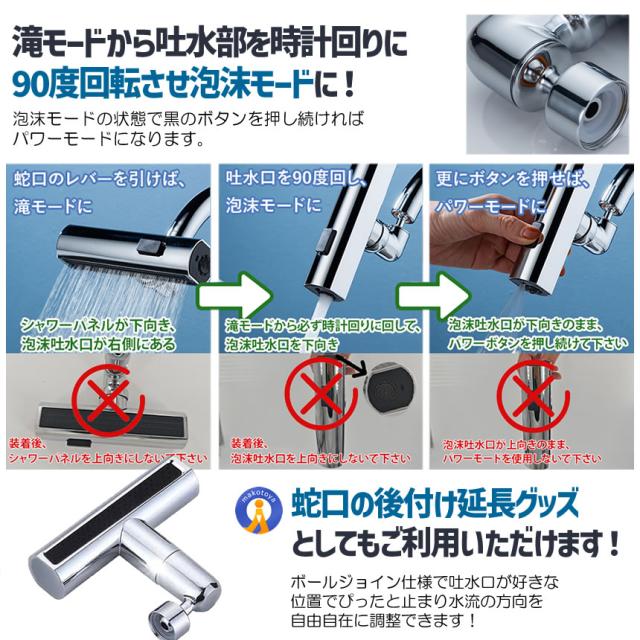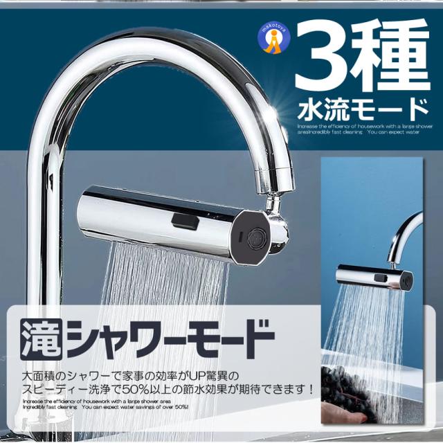 ■モード切替が超簡単「3種モード水流モード」〇滝シャワーモード大面積のシャワーで家事の効率がUP驚異のスピーディー洗浄で50%以上の節水効果が期待できます!〇泡沫モード水流が柔らかく水ハネ防止飛び散りを抑えることで水回りをきれいに保ち掃除の負担を軽減します!〇パワーモード水流が強く高圧吐水で頑固な油汚れやこってりソースなどサッと洗い落す食器の予洗いにも最適です!■シンクの隅々まで届く360度回転式&首ふりで蛇口の可動域を大幅にアップでシンクの掃除もラクラク!■高い互換性&アダプターが充実アダプター6種付き、99%の蛇口に対応可能です!送料無料