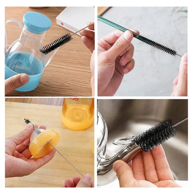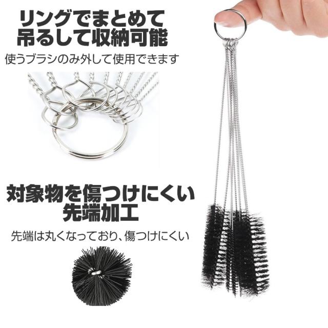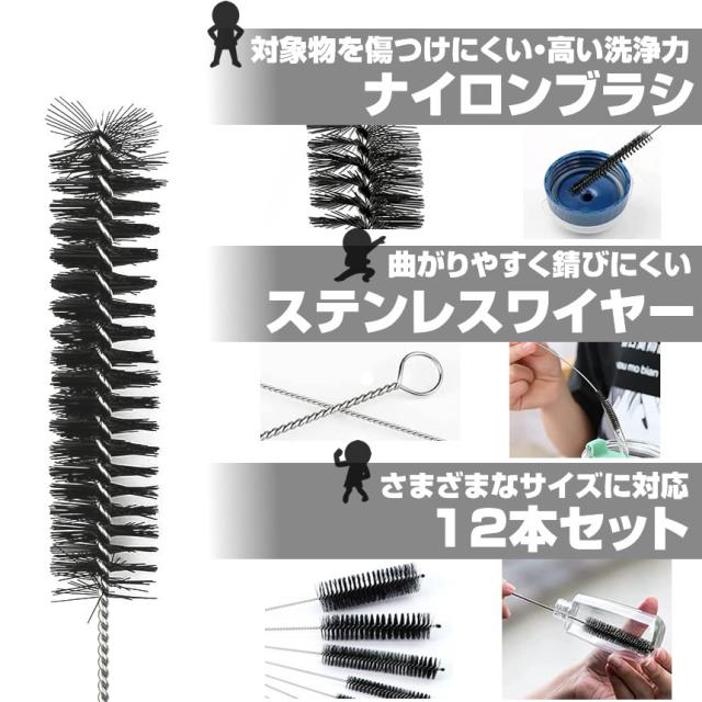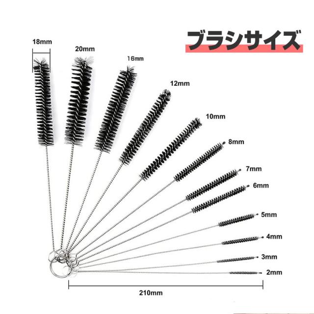 細い口の瓶や哺乳瓶などのお掃除に便利なブラシセットです。サイズは12通り!様々な大きさに対応しています。対象物を傷つけにくいナイロンブラシで、しっかり汚れを落とします。12本のブラシはリングにつけて吊るして収納も可能なくなることもありません。【サイズ】長さ:210mm ブラシ直径:20・18・16・12・10・8・7・6・5・4・3・2mm【素材】ステンレス、ナイロン【色】ブラック【使用例】哺乳瓶、ミルクボトル、ティーポットノズル、携帯電話、ストロー、細口瓶、水筒、エアコン、やかん、試験管、パイプ本州/四国/九州は送料無料※北海道は250円、離島地域及び沖縄県は650円にて承ります。