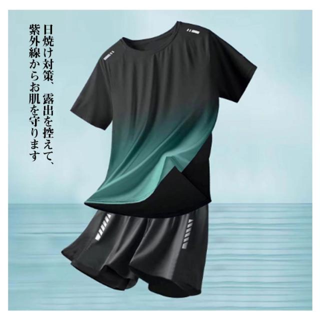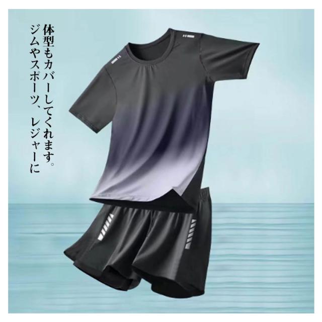 水着 メンズ 上下セット セットアップ パパ 半袖 ハーフパンツ ラッシュガード フィットネス水着 セパレート フィットネス 半袖 水陸両用 サーフパンツ UVカット 体型カバー 男性 ブラック スポーツ水着 ジム スポーツジム プール 海 大きいサイズ 黒 送料無料