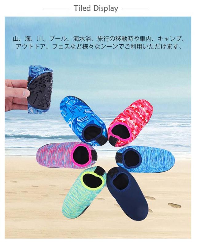 | 山、海、川、プール、海水浴、旅行の移動時や車内、キャンプ、アウトドア、フェスなど様々なシーンでご利用いただけます。 [吸汗速乾]汗を吸収してすばやく発散、サラサラの肌触りが持続 [水陸両用]水に濡れても快適に活動できる生地を使用。 [水場での怪我予防に] サンダルよりも丈夫な素材でしっかりと足にフィット。 水場でも脱げることなく足をケガから守ります。 足元が見えない深さや熱い砂浜でも安心。 [優れた速乾性] 乾きやすい素材で、濡れた後にも扱いやすい。 そのまま車などの乗り物にも乗れる軽快さ! 川や海で遊んでそのままドライビング! [脱ぎ履きらくらく] スニーカー感覚で履けて脱ぎ履きしやすく、軽量なのでストレスフリー。 [足場が悪くても滑りにくい] グリップ力が強く、滑りにくいゴムソールを使用。 滑りにくく、転倒する心配が軽減されて安心安全。 | |