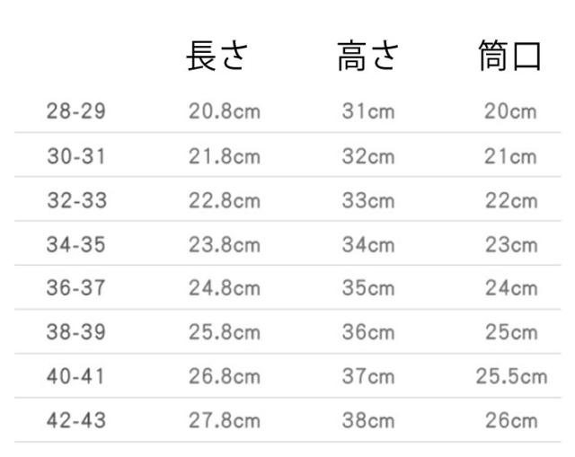 | サイズ | 28-29(19-19.5cm) 30-31(20-20.5cm) 32-33(21-21.5cm) 34-35(22-22.5cm) 36-37(23-23.5cm) 38-39(24-24.5cm) 40-41(25.0-25.5cm) 42-43(26-26.5cm) |