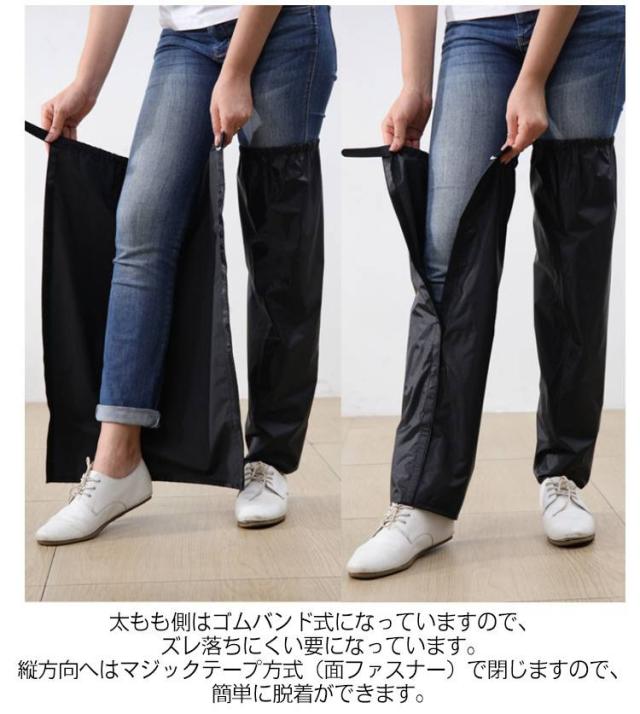 | 雨や泥から足回りをしっかり守ってくれるレッグカバー。 靴を履いたままカンタンに脱着ができる、脚だけのレインコートです。フルオープンタイプのレッグカバーなのでオーバーパンツを履くより簡単に雨からズボンを守ります。 太もも側はゴムバンド式になっていますので、ズレ落ちにくい要になっています。縦方向へはマジックテープ方式(面ファスナー)で閉じますので、簡単に脱着ができます。 左右セットの商品ですが、2つを組み合わせると腰回りの防水エプロンとしても使用可能です。 雨の日のバイク・スクーター・自転車通勤・通学で役立ちます。 | |