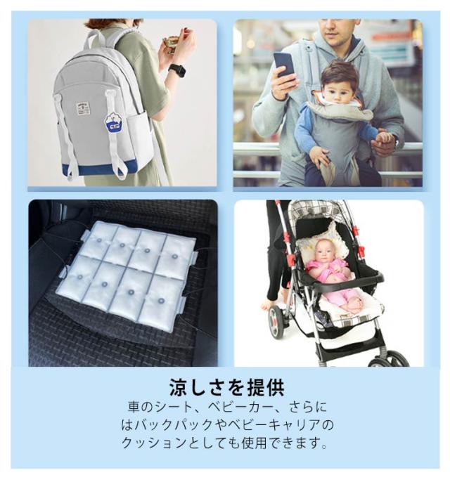 | 新素材PCM 28℃以下で自然凍結 リュック用冷感パッド ☆(リュック用冷感パッド)表面には耐久性が高く軽量で持ち運びがしやすいTPU素材です。 プラスチック素材ではありますが、一般的なイメージである硬さはなく柔軟性を持ち合わせています。 ☆内部には氷のように溶けずにひんやりをキープするPCM(Phase Change Material)素材です。 この素材は、周囲の温度が上昇しても一定の温度帯で止まり、熱を吸収して一定の温度を維持してくれるので、氷よりも長時間使用する事が出来ます。 そして、PCMは水よりも30%軽いので、背負っていても重たさを感じません。 ・冷蔵庫不要! 28℃以下で凍る冷却素材「PCM使用」。冷蔵庫等で冷やす必要がなく自然に凍結します。 ・使いやすさ: 洗えてメンテナンスが簡単、アクセスしやすいコントロールで使いやすく、 どんな冒険にも簡単に折りたたんで保管できるカーシート冷却パッドで旅を活性化します。 ・涼しさを提供:車のシート、ベビーカー、さらにはバックパックやベビーキャリアのクッションとしても使用できます。 この多機能カーシート冷却パッドで、どんな状況でもお子様を涼しく快適に保ちます。 | |