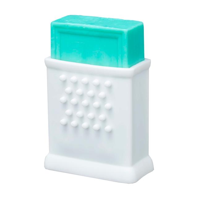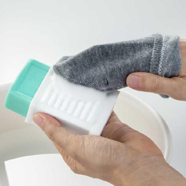 石けんでの衣類の手洗いが快適になる石けんホルダーです。石けんがすっぽり入るシリコーン製のホルダーなので、滑らずしっかり洗うことができます。使った後は、立てて保管できるので、ソープトレーのようにベタベタになることもありません。