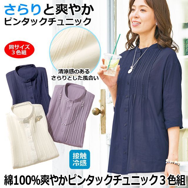 レディース 7分袖 トップス(接触冷感 綿100% 爽やかピンタックチュニック 3色組)大人可愛い おしゃれ 夏 ミセス シニア 敬老の日 プレゼント