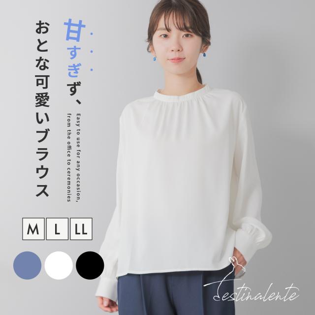 キーワード:体型カバー 卒業式 入学式 入園式 七五三 ビジネスブラウス 長袖ブラウス 細身せ 洗える シワになりにくい 大人コーデ お宮参り 結婚式 生保 スタンドカラー クルーネック 20代 30代 40代 50代 フェスティナレンテ Festinalente ブランド 二の腕カバー