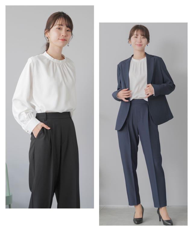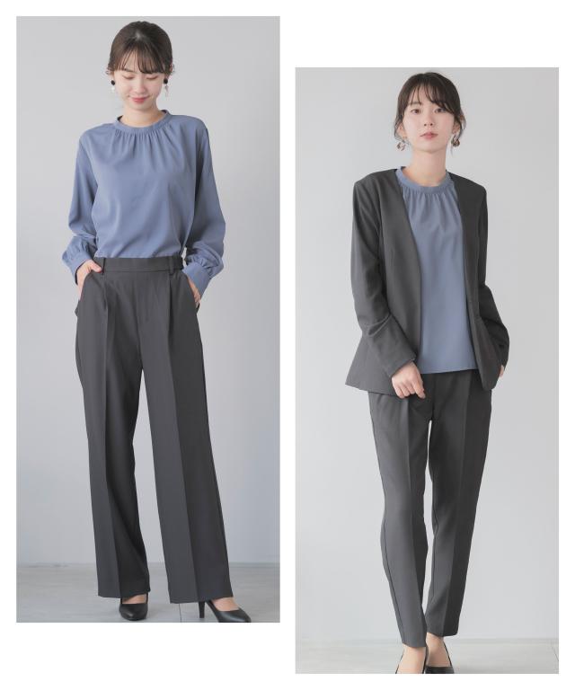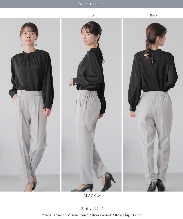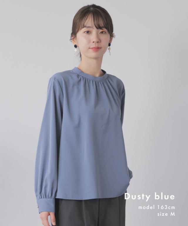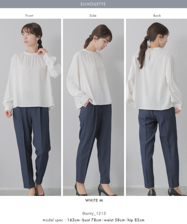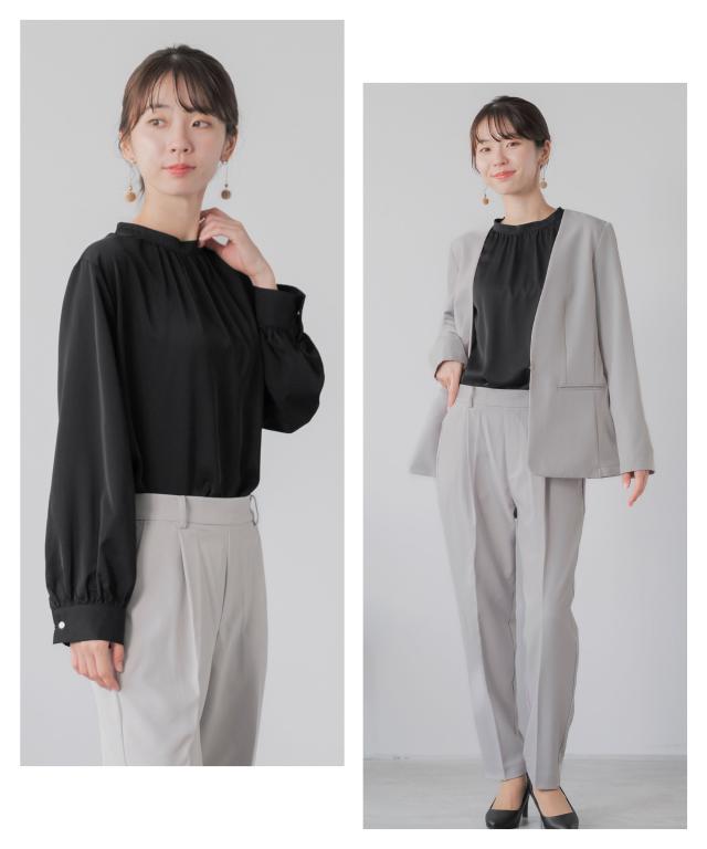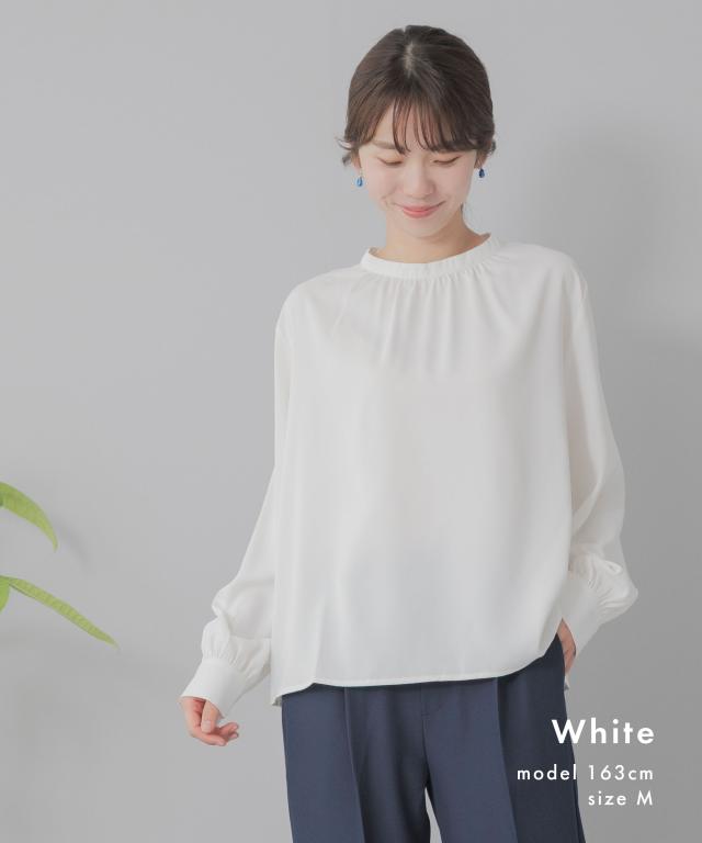 襟元のギャザーが目を惹くスタンドカラー、控えめのギャザーだから1枚でも、ジャケットインにも 。オフィスブラウスとして、またセレモニーシーン、フォーマルシーンにも使い回しが叶います