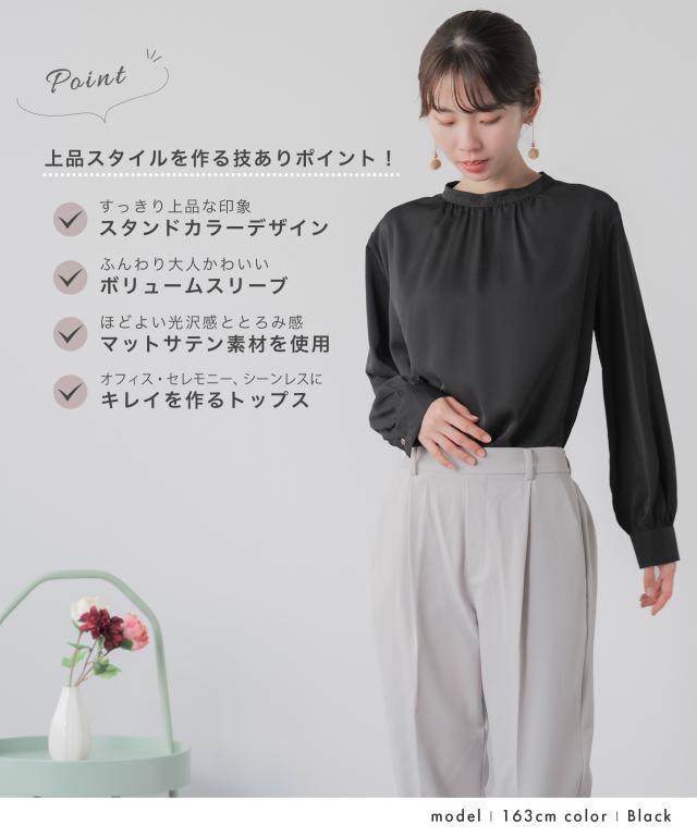 控えめな光沢ととろみ感が魅力のマットサテン、コーデに大人の雰囲気をプラスしてくれるスタンドブラウス。ふんわり広がる袖は多めに分量を取り二の腕をカバー。ギャザーをとったカフスで細身せしてくれるシルエット、カフスと後ろスリットにはゴールドボタンを採用、アクセントを加えながらも主張しすぎない小さめのボタン