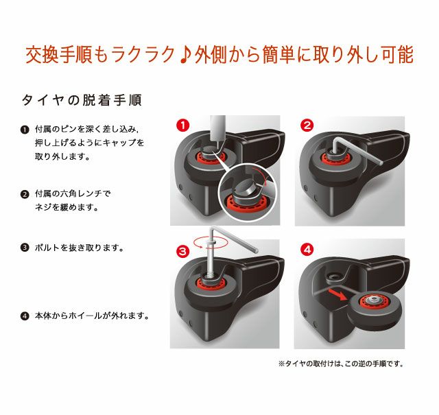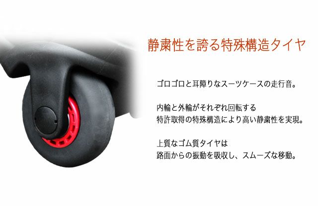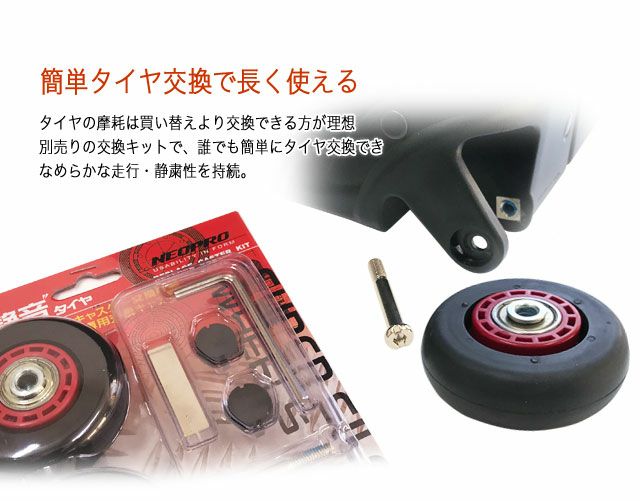 | 「NEOPROレッド」キャリー超静音タイヤを 簡単に交換可能。超静音の特殊構造タイヤ。 外側から簡単に消耗タイヤを交換可能。 | |
