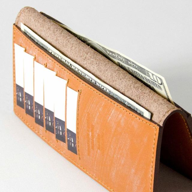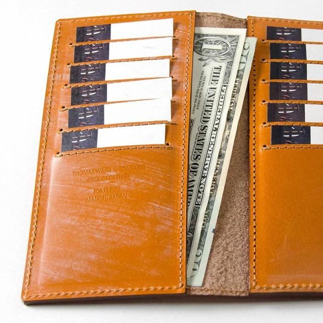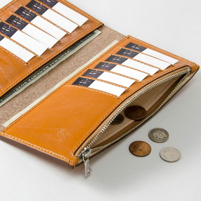商品説明:馬具にも用いられる英国製ブライドルレザーを使用した贅沢な逸品。12枚のカードが入る二つ折り長財布