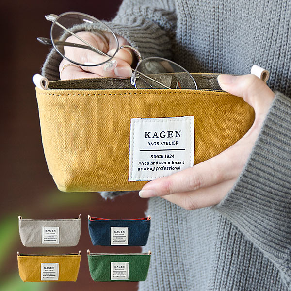 メガネがスッポリ入る可愛いサイズで口元に付いたマグネットでパチッと閉まる。バイオ加工を施した帆布は、天然繊維特有の風合い。