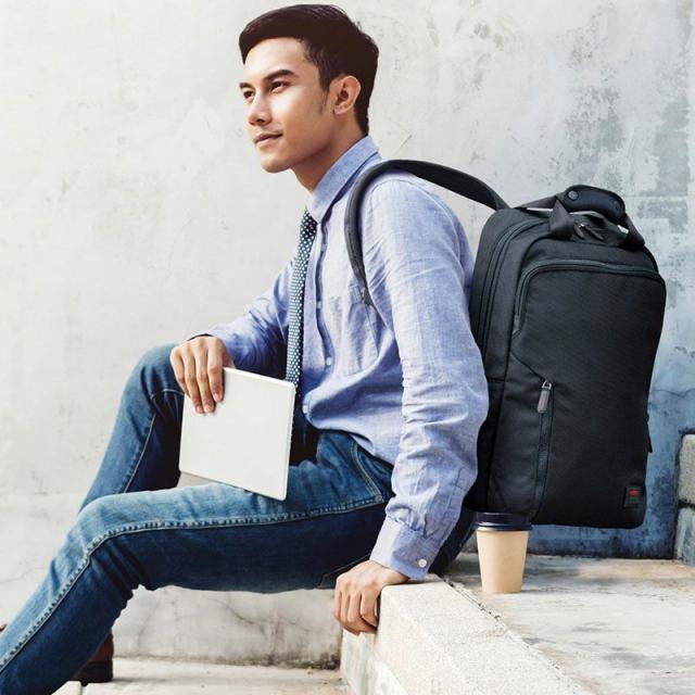 ビジネススタイルに随所につかわれた赤いポイントが精悍さとタフさを表現している。