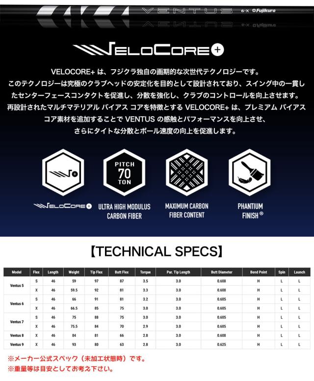 フジクラの最新技術、VELOCORE+(ベロコアプラス)を搭載した新しいVENTUSシャフトに、手元調子系のハードモデル「ブラック」が追加。クラブヘッドの安定化を図りながら、ボールの打ち出しをより一貫させてスピードアップ。