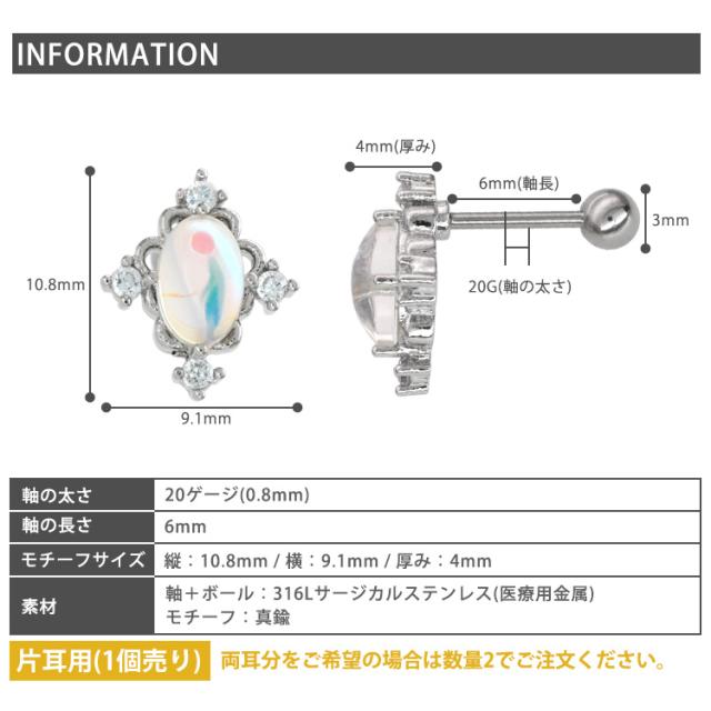 小粒ジュエルのレースフレームが、オーロラの煌めきを引き立てるデザイン。 太さは普通のピアスと同じ20Gなので、どなたでもお使いいただけます。 軸とボール部分はサージカルステンレス製ですが、モチーフは真鍮製ですので、アレルギーの強い方はお控えください。