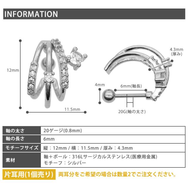 イヤーカフが落ちてしまう方必見。ストレートバーベルの軸が付いたイヤーカフなので、落ちる心配がありません。 3連リングのような重ねデザインと華やかに散りばめられたジュエルがゴージャス。 太さは普通のピアスと同じ20Gなので、どなたでもお使いいただけます。 軸とボール部分はサージカルステンレス製ですが、モチーフはシルバー製ですので、アレルギーの強い方はお控えください。