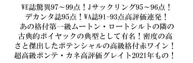 WE誌驚異97?99点!Jサックリング95?96点! デカンタ誌95点!WA誌91-93点高評価連発! あの格付第一級ムートン・ロートシルトの隣の 古典的ポイヤックの典型として有名!密度の高 さと傑出したポテンシャルの高級格付赤ワイン! 超高級ポンテ・カネ高評価グレイト2021年もの!