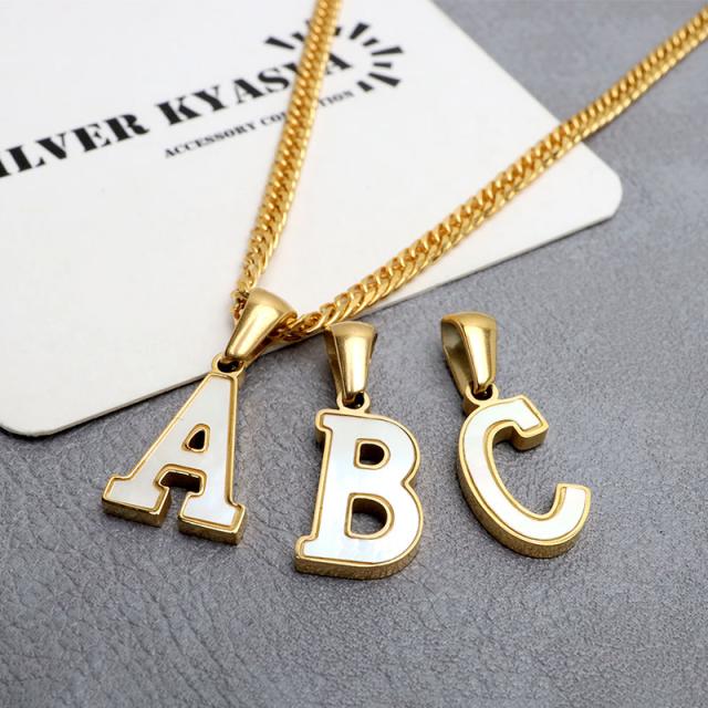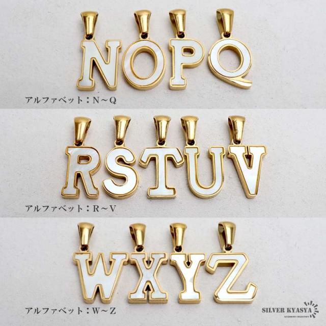 アルファベットモチーフにゴールドの縁取りが映えるネックレス。角度によってシェル特有の虹色の光彩が輝く美しいアイテムです。自分へのご褒美や、大切な人への贈り物にもおすすめの一品です。