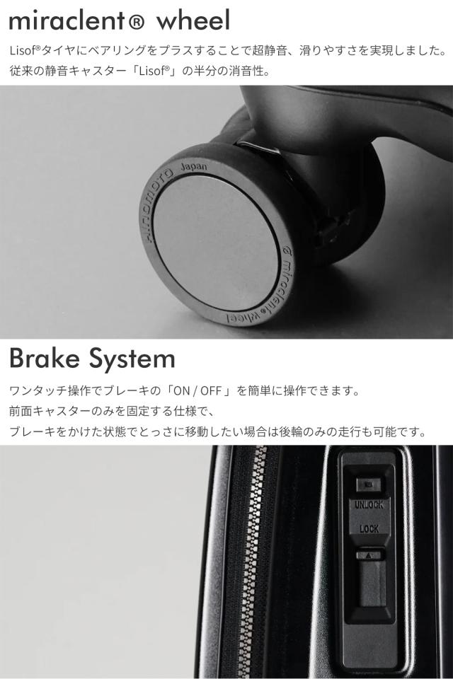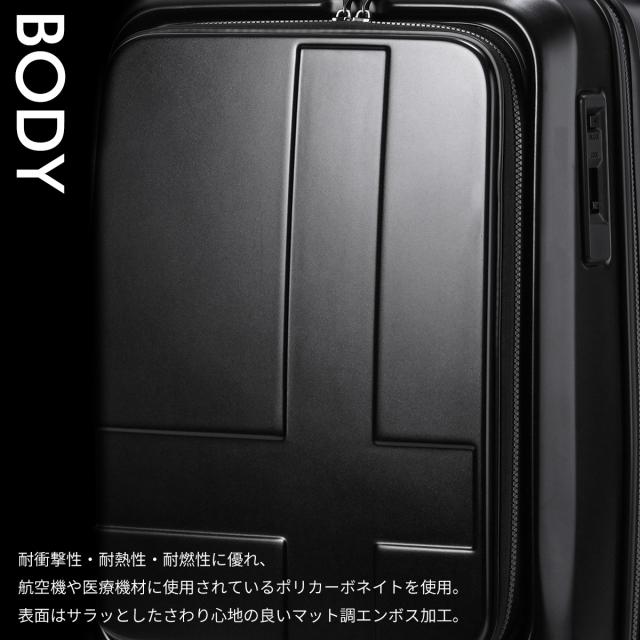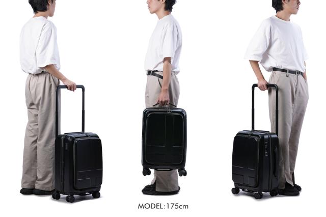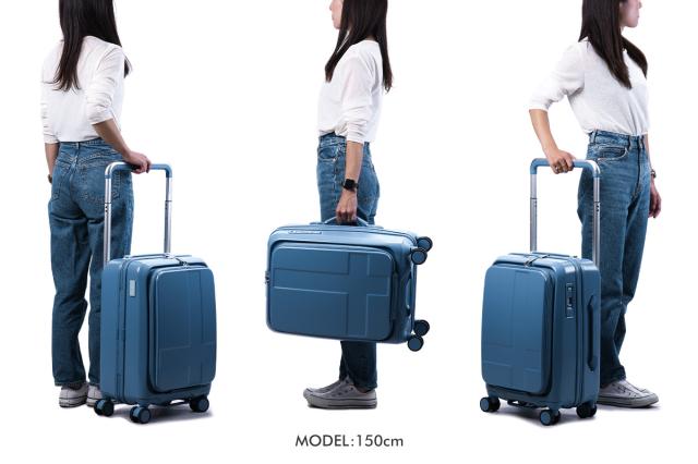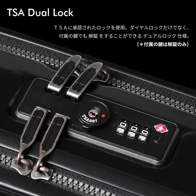 | わずかな力で「押す・引く・前後左右」の移動が安定する「ワイドキャリーシステム」が特徴のスーツケース。通常のキャリーハンドルと比較して、押して動かした際に抜群の走行性を発揮します。 ハンドルや、バーの配置に工夫を凝らし、デッドスペースをなくすことで、収納スペースを確保しました。また、フロントポケットエリア・ミドルエリア・メインエリアの3ROOM収納で、荷物を分別し、スマートに収納。13インチノートPCを収納可能なPCポケットを搭載したフロントポケットは、本体収納へもアクセスが可能。アイテムが一目で確認できるメッシュ生地のポケットも装備しています。 機能性も抜群で、Lisof®タイヤにベアリングをプラスすることで超静音、滑りやすさを実現。従来の静音キャスター「Lisof®」の半分の消音性です。ブレーキシステムは、ワンタッチ操作「ON / OFF」を簡単に操作できます。前面キャスターのみを固定する仕様で、ブレーキをかけた状態でとっさに移動したい場合は後輪のみの走行も可能です。セキュリティ面ではTSAに承認されたロックを使用。ダイヤルロックだけでなく、付属の鍵でも解錠をすることができるデュアルロック仕様です。また、ボトムやサイドに配置したハンドルによって取り回しが楽にできます。階段利用時や、網棚や車のトランクケースなどからスーツケースを上げ下げする時などに活躍します。ファスナーには業界初の軽量・耐久性に優れたビスロン®ファスナーを採用しています モバイルバッテリー収納も付属。ファスナー引手がここだけ色が違う為、見やすく使いやすい仕様です。USBポートへ接続することで、移動時でも充電や電源供給が可能になります。 ボディーには耐衝撃性・耐熱性・耐燃性に優れ、航空機や医療機材に使用されているポリカーボネイトを使用。表面はサラッとしたさわり心地の良いマット調エンボス加工。 |