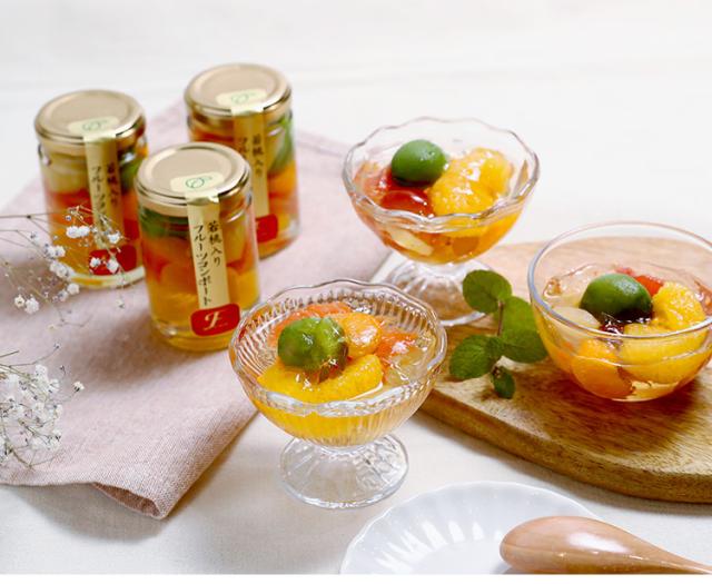 翡翠色の若桃(種ができる前の桃)をはじめ、みかん・甘夏・グレープフルーツ・パイナップルを、ふるふる食感のジュレで包みました。華やかな見た目は贈りものにぴったり。食べきりサイズも嬉しいお品。冷やしてそのままはもちろん、炭酸と合わせてフルーツポンチに、ほんのり凍らせてシャーベット風にしてもお楽しみいただけます。