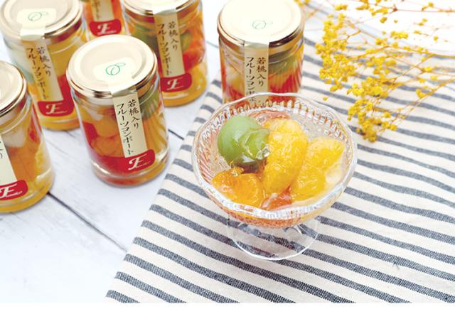果肉 甘夏 (愛媛県産)、グレープフルーツ (トルコ)、みかん (和歌山県産)、 若桃(和歌山県産)、 パイナップル (タイ)、 糖類(砂糖、ぶどう糖液糖)、 洋酒/ゲル化剤(増粘多糖類)、酸味料、香料、酸化防止剤(ビタミンC)、(一部にももを含む)