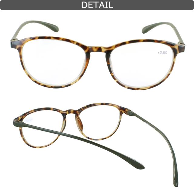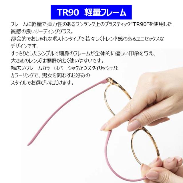 軽量で弾力性のあるTR90素材を使用した細身のボストンタイプのリーディンググラス