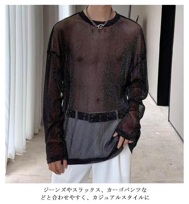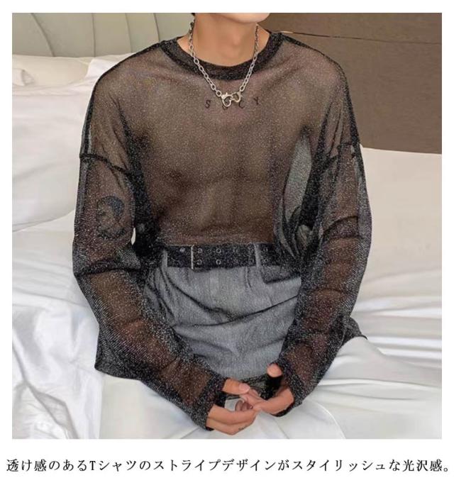 透け セクシー Tシャツ シースルー 透け カジュアル シアートップス 春夏 トップス 透け感 ロンT 長袖 ラメ系 おしゃれ 薄手 メンズ 4XL 韓国ファッション シアーブラウス シアーシャツ キラキラ ダンスウェア M L XL 2XL 3XL 重ね着