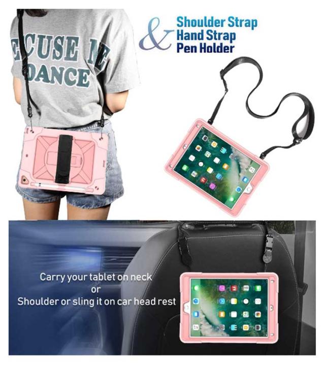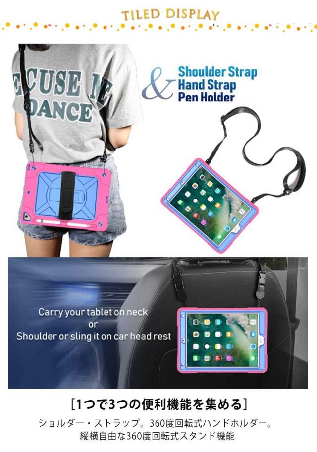| ショルダーストラップ付 多機能iPadケース 3in1 [1つで3つの便利機能を集める] ショルダー・ストラップ。360度回転式ハンドホルダー。縦横自由な360度回転式スタンド機能 [落下防止] 3層構造で衝撃や落下による破損から大切な本体を守る | |