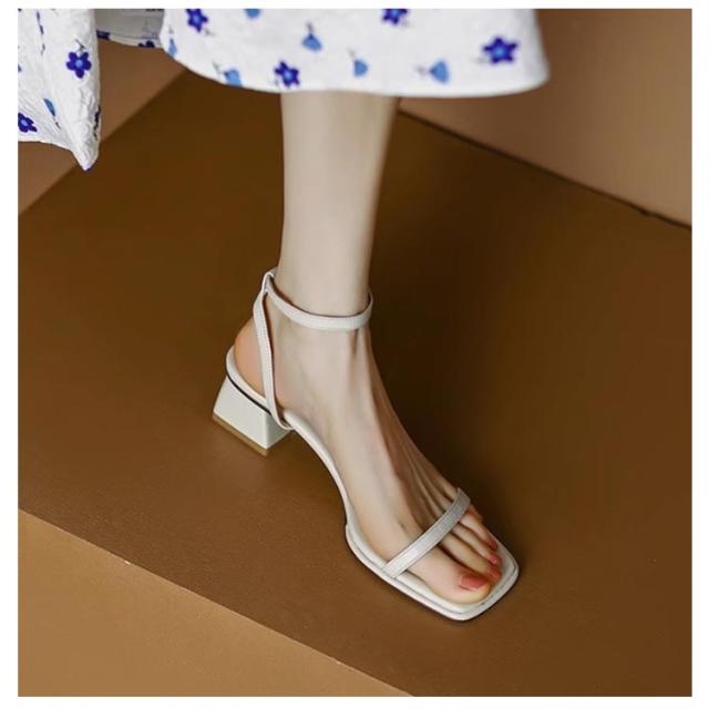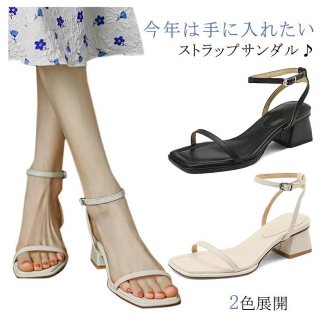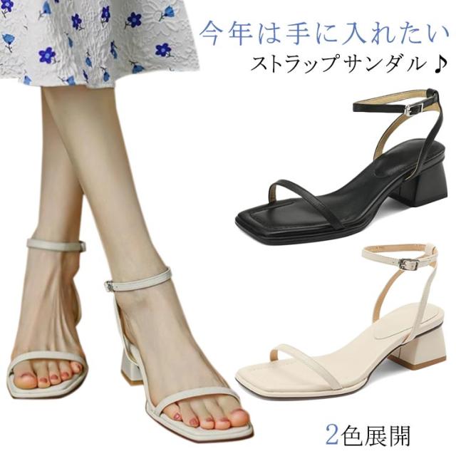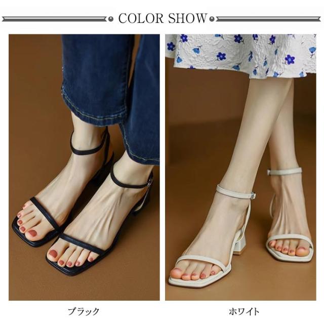 美脚 レディース ストラップ スクエアトゥ サンダル おしゃれ アンクルストラップ 22-24.5cm 歩きやすい 疲れにくい 細ストラップ 調節可能 チャンキーヒール 大人 シューズ