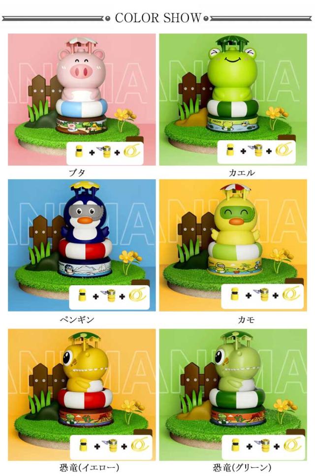 | 色 | ブタ カエル ペンギン カモ 恐竜(イエロー) 恐竜(グリーン) |