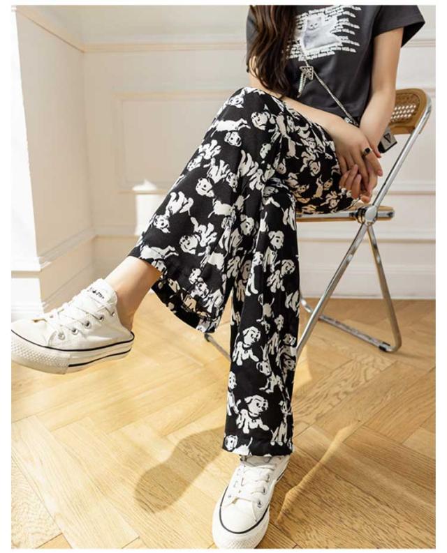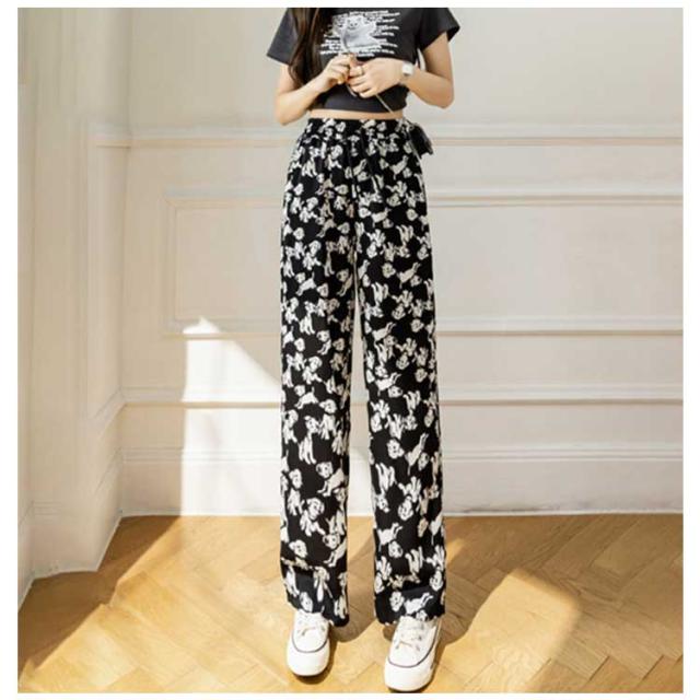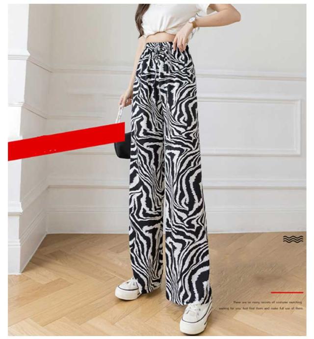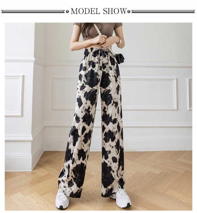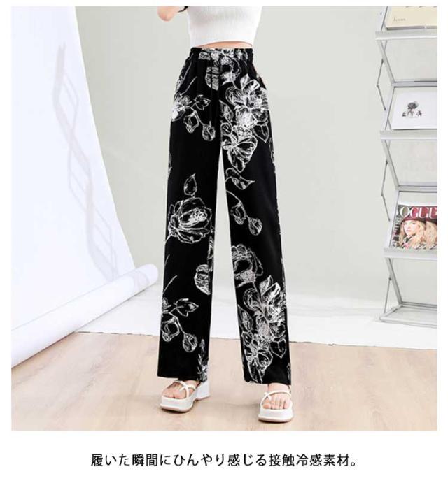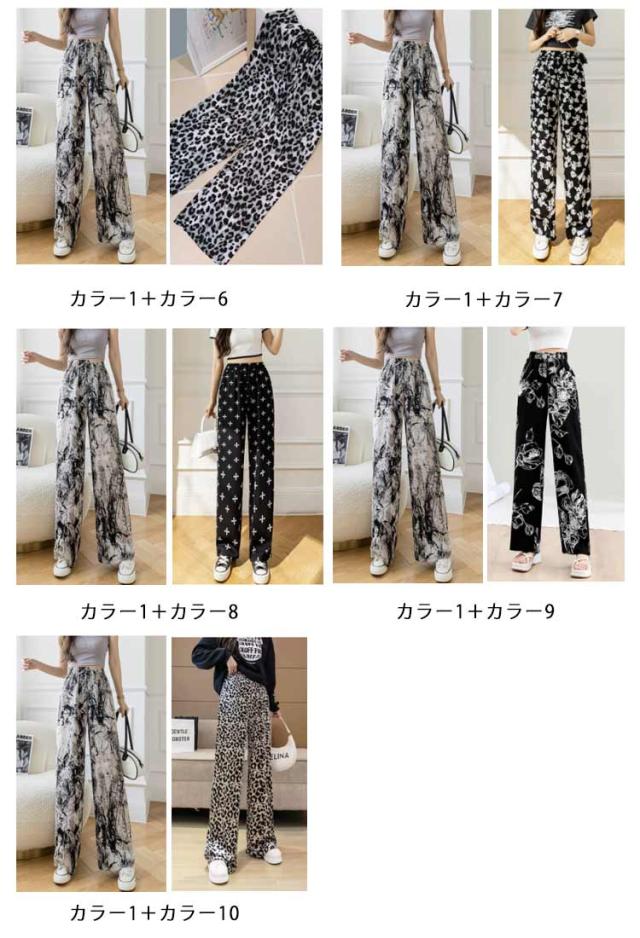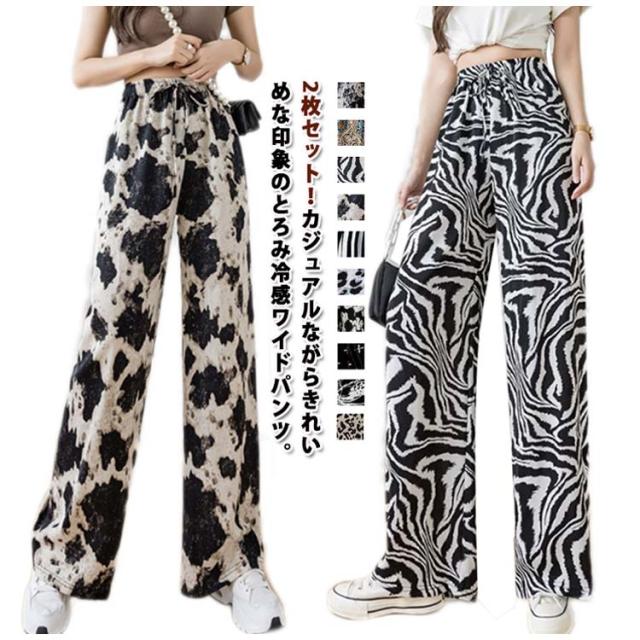 ハイウエスト ワイドパンツ イージーパンツ 接触冷感 夏 ロング ヒョウ柄 ストライプ柄 ワイド 冷感 アイスシルクパンツ レディース とろみ 薄手 体型カバー 落ち感 ゴムウエスト 涼感 2枚セット 総柄 カジュアル ストリート おしゃれ
