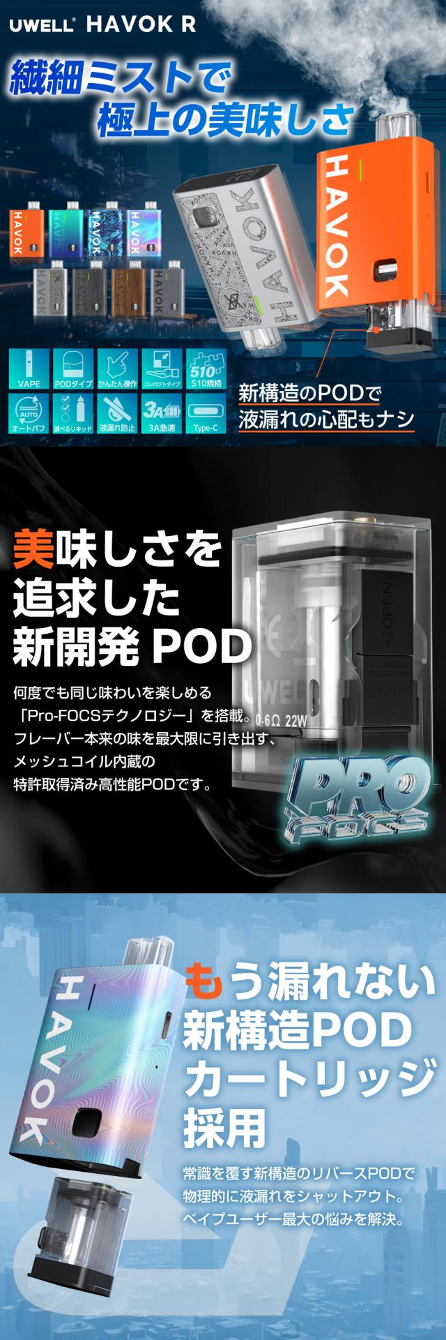 フレーバーの再現度が好評のUWELL (ユーウェル社)から、追及された美味しさと斬新な新構造PODを採用した「UWELL Havok R」(ユーウェル ハボック R)が新登場。