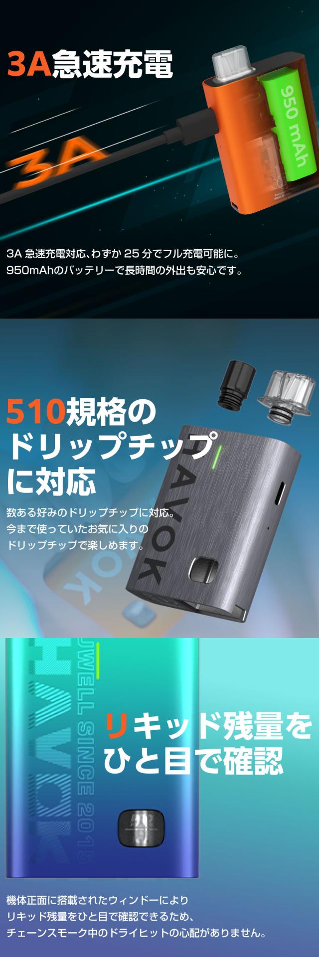 さらに、最も普及している510規格のドリップチップへ対応しており、お好みのドリップチップで自分好みのフレーバーをよりお楽しみいただけます。