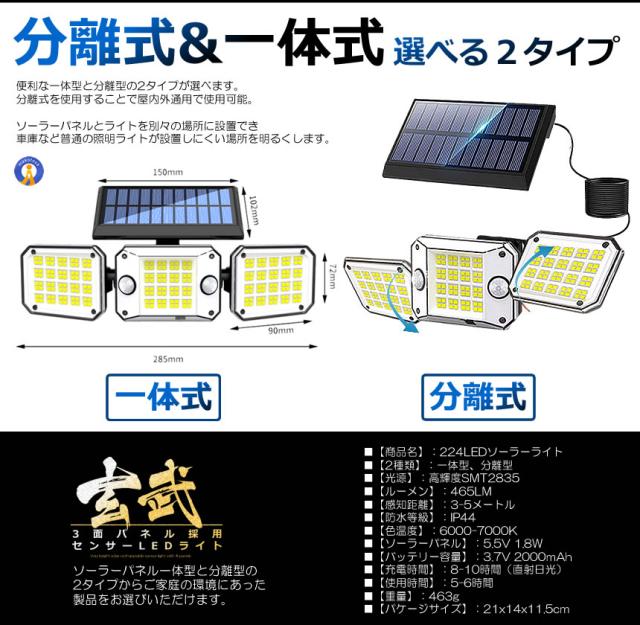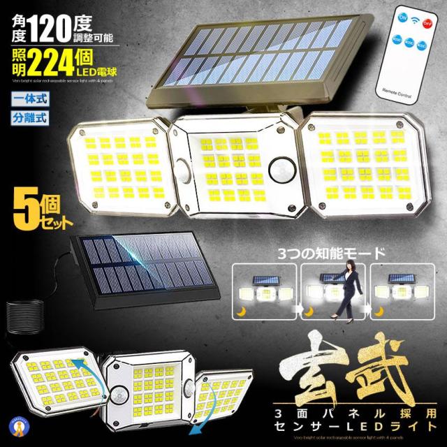 5個セット 224LED センサーソーラーLEDライト ガーデンライト 3面式 玄武 屋外 明るい 庭 人感センサー 防水 広角 リモコン 3つの知能 224SORAZI