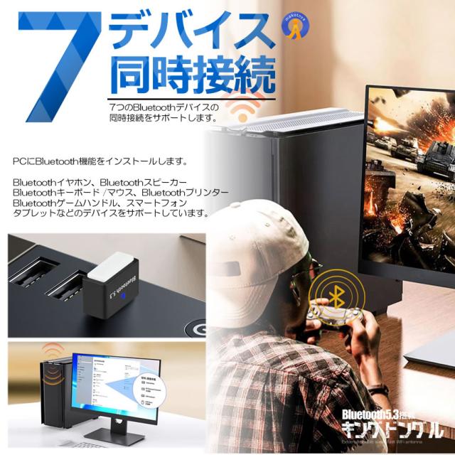 Bluetooth5.3搭載最新のBluetooth5.3を組み込み現在のBluetooth5.0よりも遅延が低く干渉が強く消費電力が低くなります。Bluetoothの以前のバージョンを装備したオーディオデバイスと完全に後方互換性があります。7デバイス同時接続7つのBluetoothデバイスの同時接続をサポートします。PCにBluetooth機能をインストールします。Bluetoothイヤホン、BluetoothスピーカーBluetoothキーボード /マウス、BluetoothプリンターBluetoothゲームハンドル、スマートフォンタブレットなどのデバイスをサポートしています。送料無料