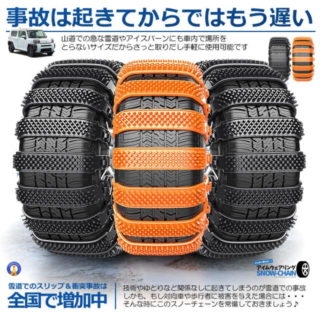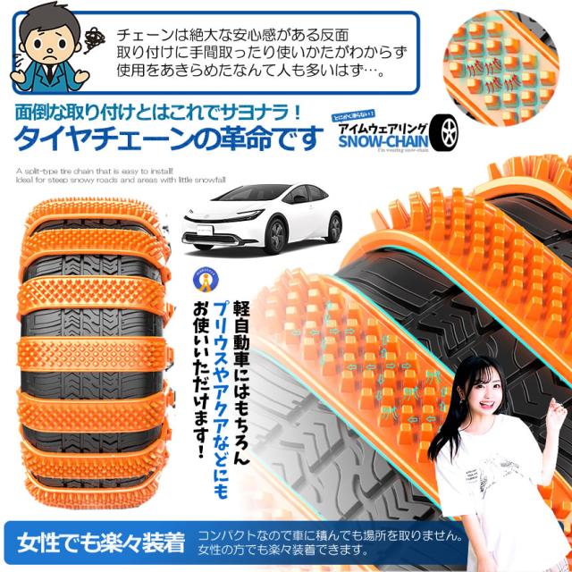 最強の滑り知らず&サイズ調節可能「スノーチェーン 」が登場分割式で取付簡単なタイヤチェーンです!急な雪道や積雪の少ない地域に最適!軽自動車にはもちろんプリウスやアクアなどにもお使いいただけます!また、コンパクトなので車に積んでも場所を取りません。山道での急な雪道やアイスバーンにも車内で場所をとらないサイズだからさっと取りだし手軽に使用可能です事故は起きてからではもう遅い・・・雪道でのスリップ事故は衝突事故は全国で増加中です!!技術やゆとりなど関係なしに起きてしまうのが雪道での事故しかも、もし対向車や歩行者に被害を与えた場合には・・・そんな時にこのスノーチェーンを常備しておきましょう♪女性の方でも楽々装着できます。簡単3ステップ装着※チェーンを装着する時は平面でサイドブレーキをしっかり引いて※周りの安全を確認し作業を行ってください。送料無料※北海道・沖縄県は別途送料が必要になります。