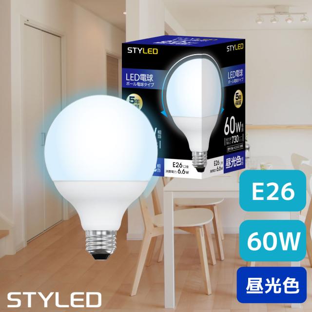 【昼光色・E26口金・60W相当】LED電球 E26口金 60W相当 ボール電球形 広配光タイプ 昼光色(730lm)