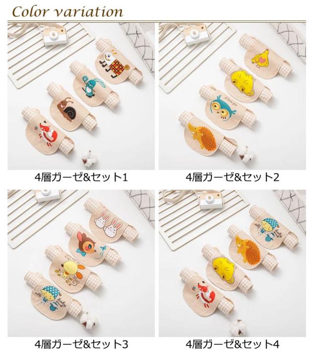 | 4枚セット!汗を取りながらおしゃれも楽しめるベビーアクセサリー。 吸水性・速乾性に優れた4層ガーゼ。赤ちゃんの汗を吸収しお洋服を清潔に保ちます。 洗濯機で洗えるので、汚れたらサッと洗って清潔をキープできます。 長時間のお出かけや旅行、スポーツなどすぐに着替えられない時には大変助かる。 | |