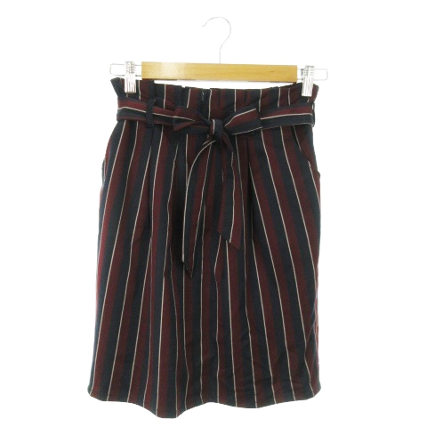 【中古】アーガ Aga スカート タイト ミニ ハイウエスト ストレッチ ギャザー リボン ストライプ 総柄 9 紺 ネイビー
