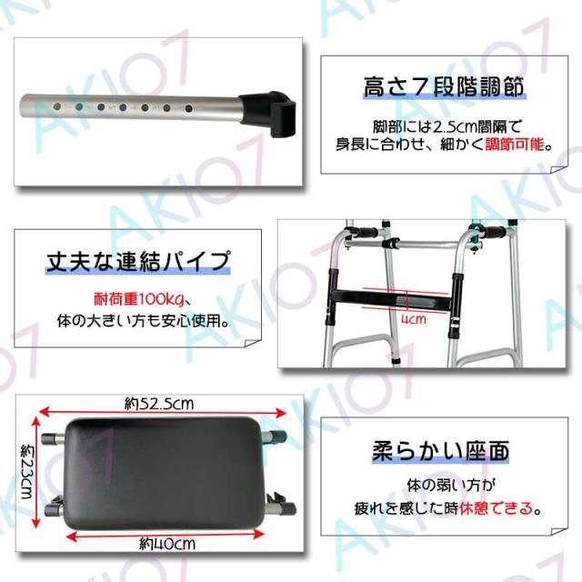 【耐久性&安定性】 錆びにくいアルミ合金材質を使用、約100KGの高耐荷重。ワイド吸盤仕様脚部を使用、優れな安定性を持つ、より滑り転倒にくいの安全な歩行器。または座面が付いており、疲れを感じた時ちょっと休憩できます。
