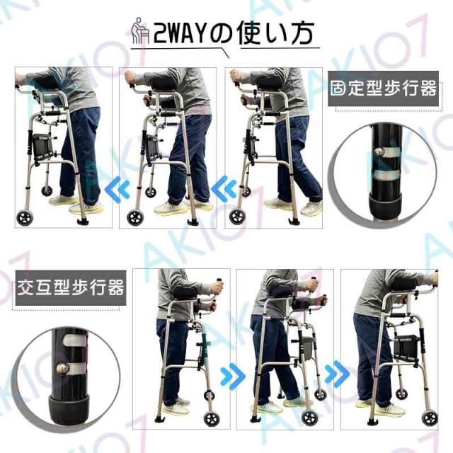 【固定・交互2way式】ご用途に合わせて、前輪にはキャスターや固定式が選択可能で、スムーズに歩行をサポートします。固定・交互・前輪キャスター三式一台、後方の脚にはソリ式脚部とゴム脚部が付属しており、ご自由にお取替え可能です。